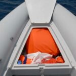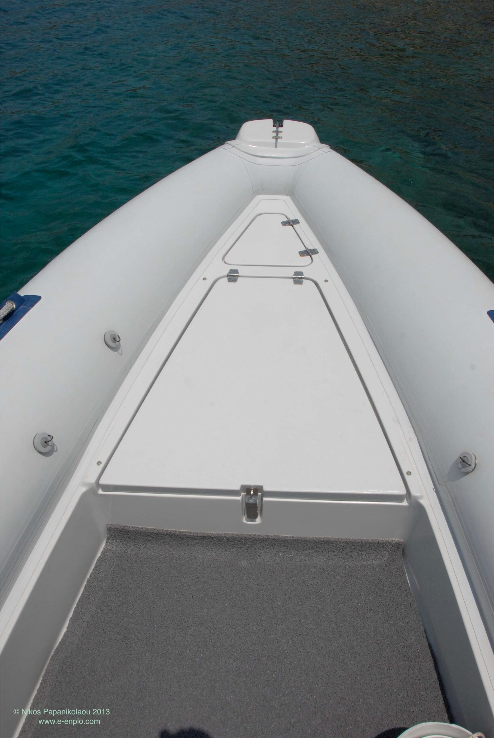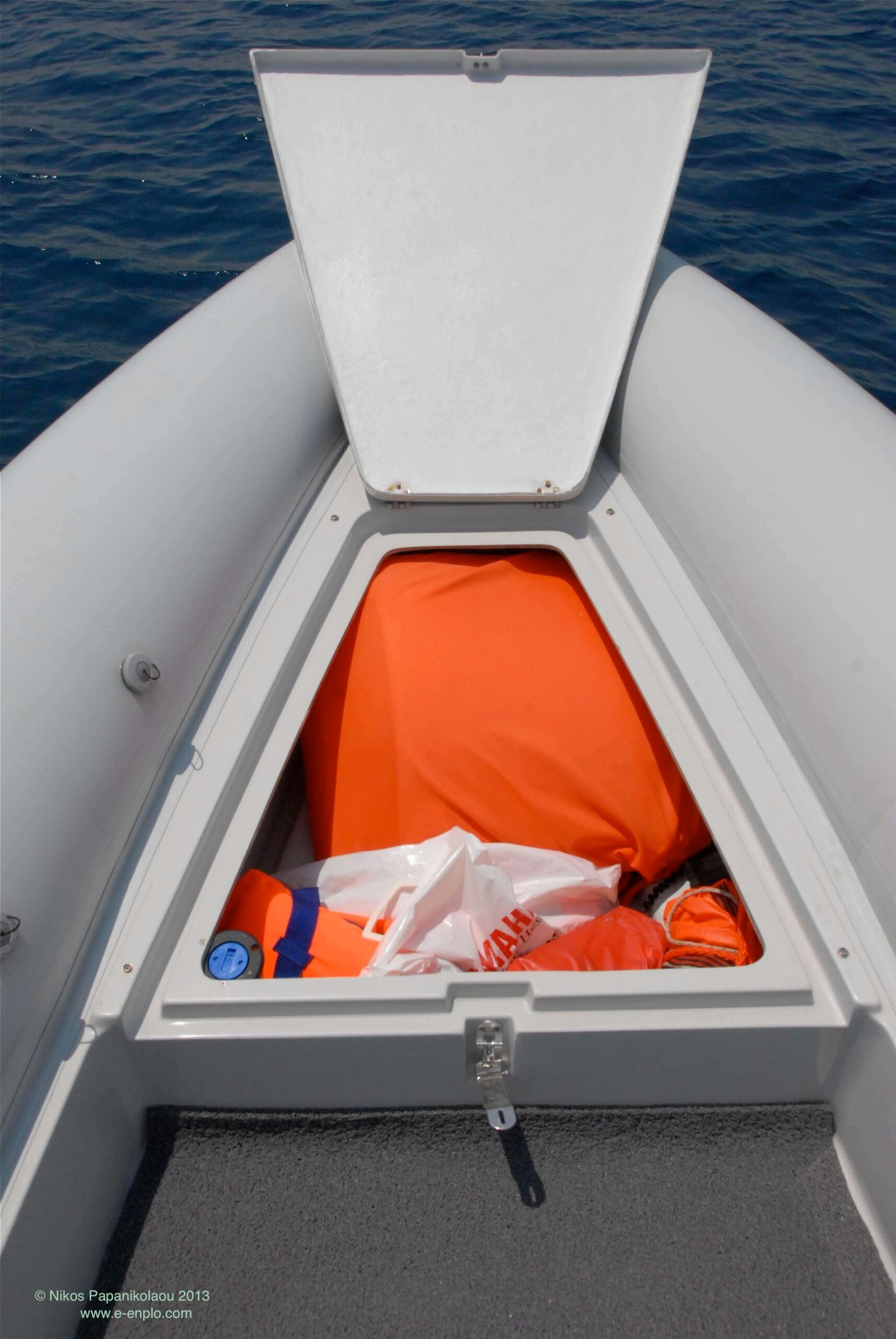 In the bow a spacious sunpad is formed for relaxation able to be extended and converted to a double berth for the overnight if needed. However, no front seating in the console exists due to the big size of the sunpad.  Other boats in this category have this feature and generally offer a more spacious layout regading the touring purpose. Underneath this structure two separate storage compartments exist, the anchor locker and an other storage space deep enough to host bulky objects such as those of the rescue equipment. The biggest storage space is located underneath the aft bench where the wiring of the electrical and fuel systems can be inspected.