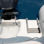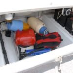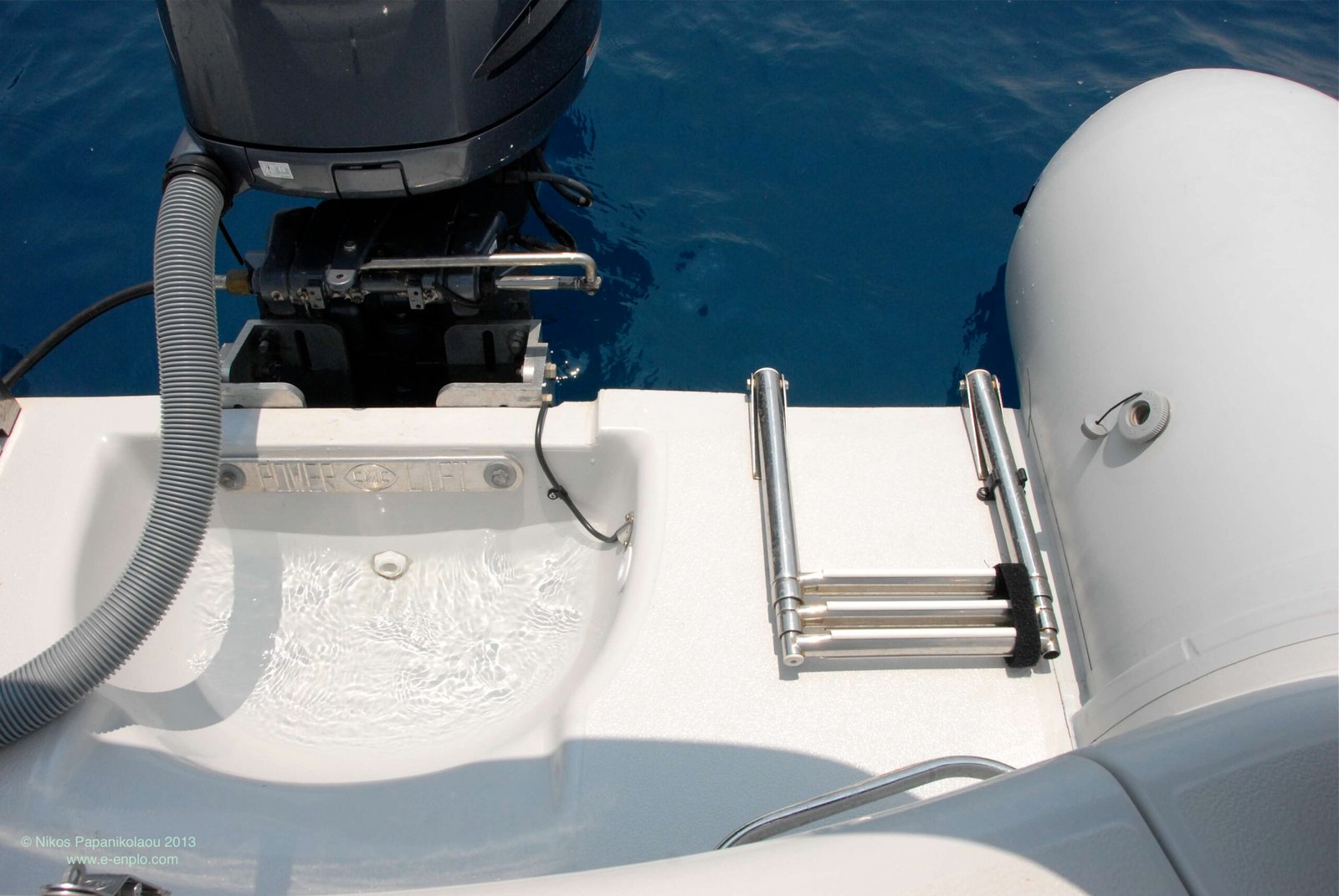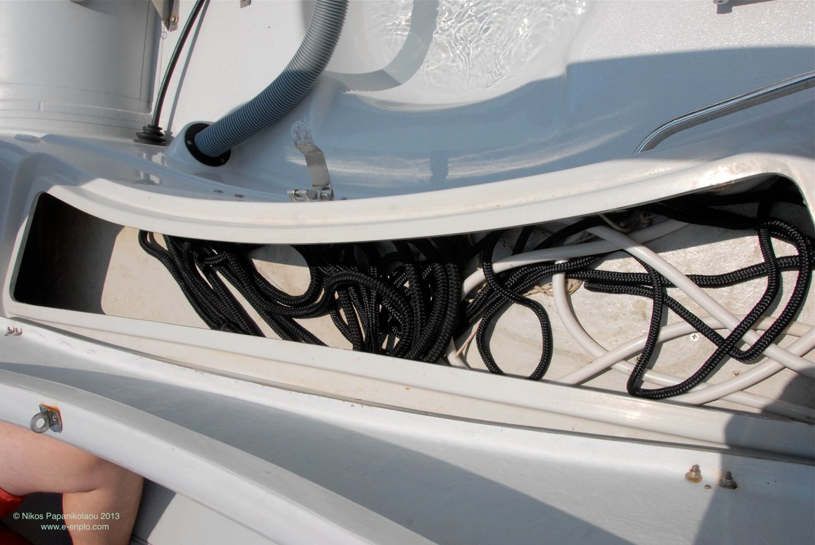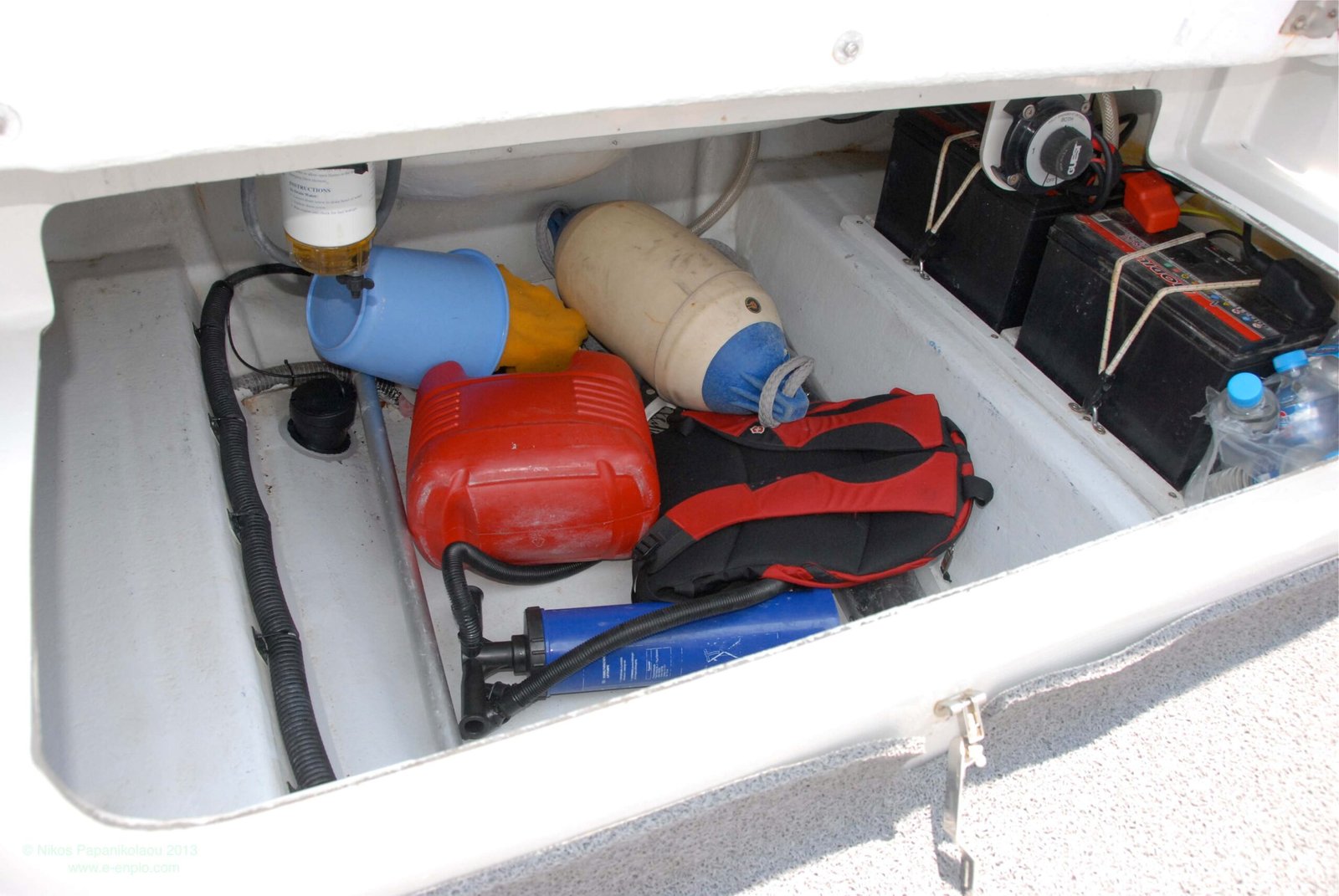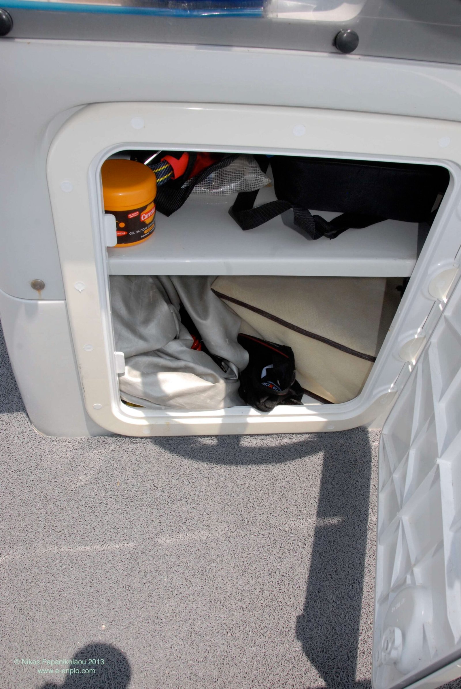 Two additional storage areas for medium and small size objects are situated in the helm post and inside the console respectively. In the stern an oblong compartment is found to enclose the lines and the second anchor, while the pathing ladder, the shower and the base for the axillary engine all are located there. In the specific boat, also, there was an optional in deck compartment in the bow area to store some of the rescue equipment taking up the space of the second fuel tank.